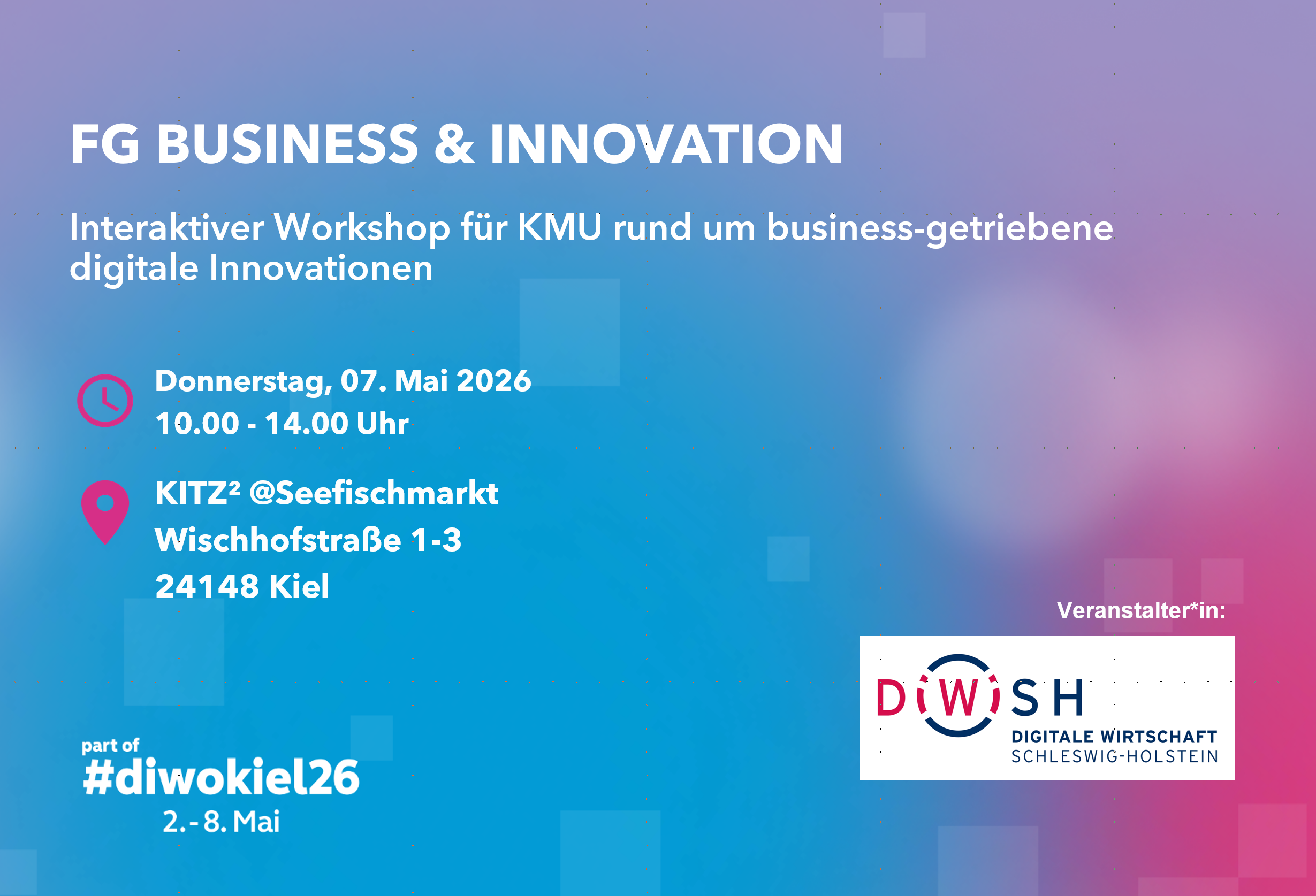 Die DiWiSH Fachgruppe Business & Innovation möchte wirksame Instrumente und Veranstaltungsformate zu Themen lancieren, die das digitale Innovationsklima in Schleswig-Holstein nachhaltig verbessern. Dazu sollen bereits vorhandene Geschäftspotenziale visibel und nutzbar gemacht, Räume für neue transformative oder disruptive Ideen geschaffen sowie Innovationsvorhaben in Organisationen verstetigt werden.
