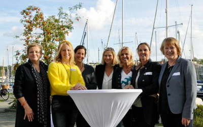 Wer gerade keinen Platz an einem der Mentoring-Tische eingenommen hatte, tauschte sich über die Vereinbarkeit von Karriere und Kind aus oder tauchte in weitere Gespräche mit anderen Teilnehmerinnen ein. Beim anschließenden Ausklang auf der Terrasse am Schwentine-Ufer konnten im Speed-Mentoring offen gebliebene Fragen noch einmal vertieft oder neue Gesprächspartnerinnen gefunden werden.