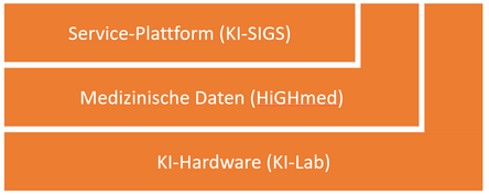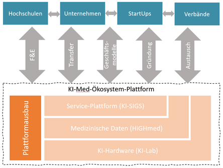 In Lübeck enstand mit dem von der IHK Lübeck initiierten "Arbeitskreis Künstliche Intelligenz" schon früh eine erste Keimzelle für regionweite Kommunikation und Kollaboration. Daraus entwickelte sich schnell das Thema "KI und Gesundheit" als zentraler Ansatzpunkt für einen Erfolg verprechenden KI-Einsatz in der Region. Die Rolle des Initiators und Plattformbetreibers innerhalb des KI-Med-Ökosystems nimmt die Universität zu Lübeck über ihr Zentrum für Künstliche Intelligenz Lübeck (ZKIL) und in Zusammenarbeit mit dem Universitätsklinikum Schleswig-Holstein (UKSH), dem Deutschen Forschungszentrum für Künstliche Intelligenz (DFKI, Außenstelle Lübeck), der UniTranmsferKlinik GmbH sowie weiteren Partnern aus dem KI-SIGS-Konsortium ein. Die aktuelle (und sich in ständiger Entwicklung befindliche) Plattformarchitektur sieht wie folgt aus:
