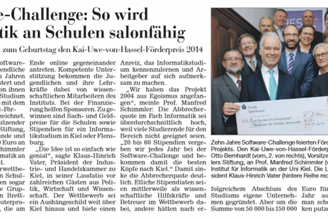 Zum 10-jährigen Bestehen hat der Wettbewerb „Software-Challenge“ den Kai-Uwe-von-Hassel-Förderpreis 2014 der Hermann-Ehlers-Akademie bekommen. In Ihrer Ausgabe vom 19. November 2014 berichten die Kieler Nachrichten über die Preisverleihung und die Erfolge des Wettbewerbs, der auch qualifizierten IT-Nachwuchs mittels Stipendien nach Kiel holt.
