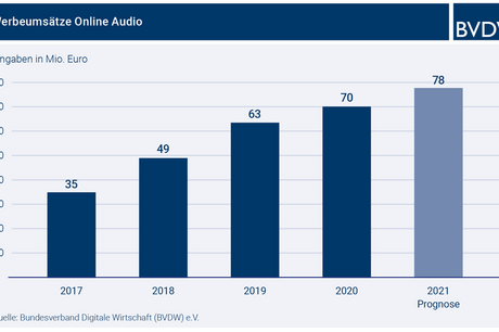 Die Werbeumsätze im Bereich Online Audio sind 2020 wie vom Bundesverband Digitale Wirtschaft (BVDW) e. V. prognostiziert auf rund 70 Millionen Euro angestiegen. Im Jahr 2019 lag der Umsatz noch bei 63 Millionen Euro. Im Bereich Podcast fielen die Werbeumsätze noch größer als vermutet aus: Statt der prognostizierten 14 Millionen Euro lag der Umsatz
