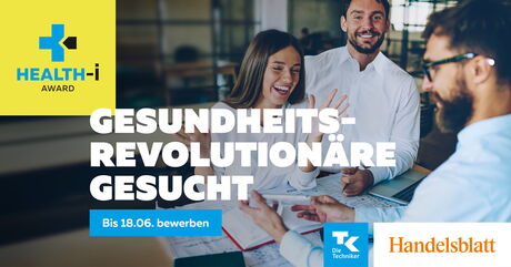 Gesundheitsrevolution jetzt! Der Health-i Award der Techniker Krankenkasse und des Handelsblatt geht in die nächste Runde. Gesucht werden gesunde Perspektiven, innovative Konzepte und mutige Ideen für das digitale Gesundheitswesen von morgen. Ausgezeichnet werden die Besten der Kategorien Junge Talente, Start-Ups und Unternehmen. Bis zum 18.06.21
