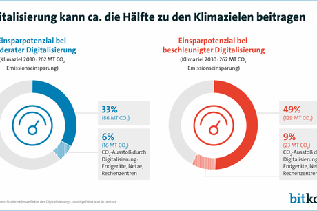 Digitale Technologien können die Hälfte dazu beitragen, dass Deutschland bis zum Jahr 2030 seine Klimaziele erreicht. Wie die im Auftrag des Digitalverbands Bitkom erstellte Studie „Klimaeffekte der Digitalisierung“ zeigt, können die CO2-Emissionen in Deutschland durch den gezielten und beschleunigten Einsatz digitaler Lösungen in den kommenden
