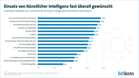 Jeweils 6 von 10 wünschen sich Künstliche Intelligenz als Service-Bot in Telefon-Hotlines und Online-Chats (63 Prozent), um Fragen schnell beantworten zu können, als Lehrer oder Dozent in Schule oder Universität (62 Prozent), zum Beispiel um Stoff zu vermitteln oder Leistungen zu bewerten, in Personalabteilungen (61 Prozent), um Bewerbungen schneller zu sichten und neutraler einzuschätzen, sowie für politische Entscheidungen (60 Prozent), etwa um die Folgen von Gesetzen besser abschätzen zu können. Eine Mehrheit (56 Prozent) befürwortet KI zudem auch im militärischen Bereich, etwa um Satellitenbilder automatisiert auszuwerten.