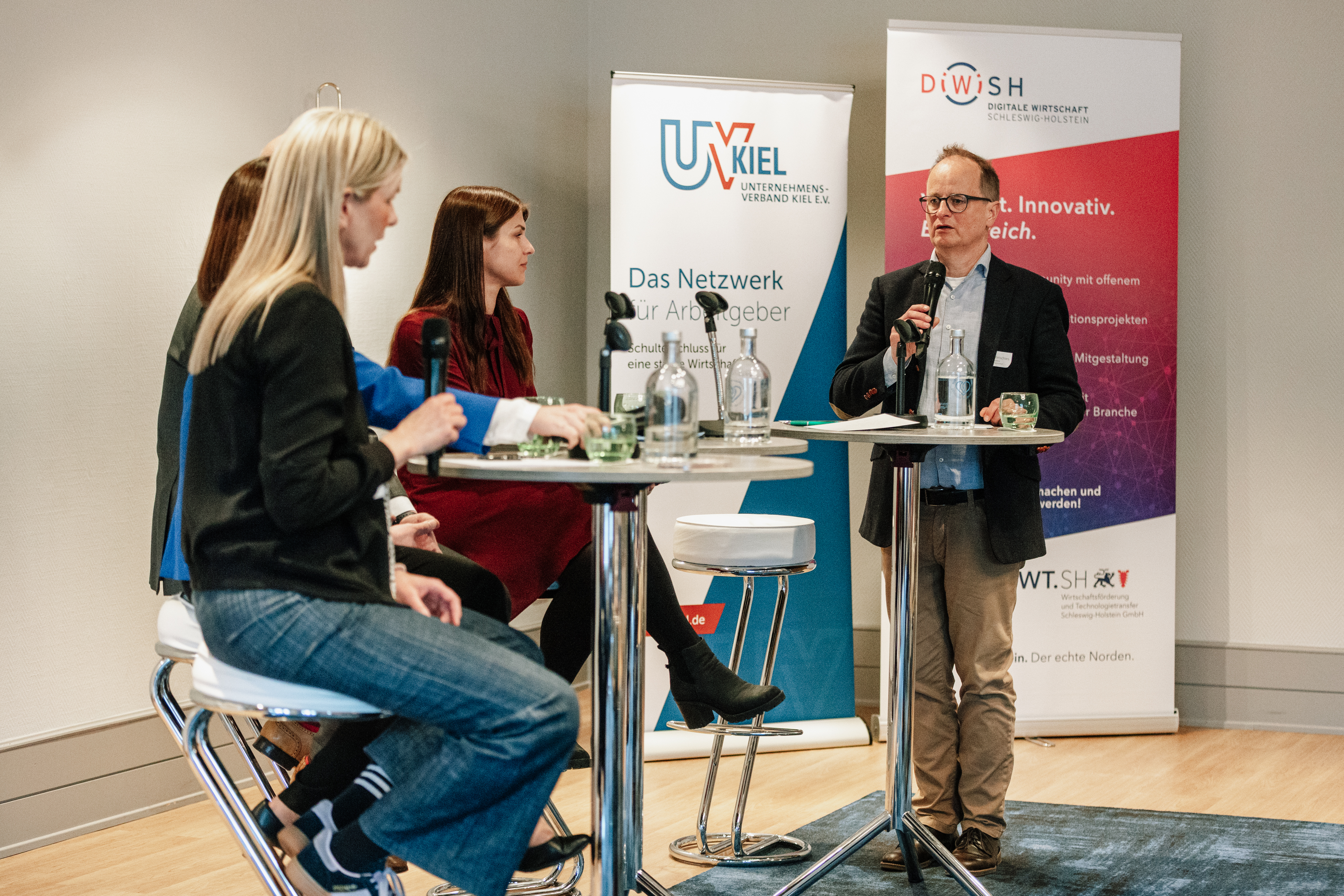 Ein weiterer zentraler Punkt war die Bedeutung von Reichweite und Netzwerken. Insbesondere kleinere und mittlere Unternehmen können von Multiplikatoren profitieren, um ihre Sichtbarkeit als Arbeitgeber zu steigern. Und da kam die DiWiSH ins Spiel: Mit einem Impulsvortrag von Inga Karlisch, Projektmanagerin von FachkraftDigital.SH, wurde der Abend um wertvolle Angebote für Unternehmen der Digital- und Medienbranche in Schleswig-Holstein ergänzt. Ziel des Projektes ist es, die Sichtbarkeit dieser Unternehmen erhöhen, gezielt Fachkräfte anzusprechen und neue Formate für den Austausch zwischen Unternehmen und Talenten zu schaffen. Beim Impuls ging Inga besonders auf die aktuellen Teilnahme-Möglichkeiten für Unternehmen ein: