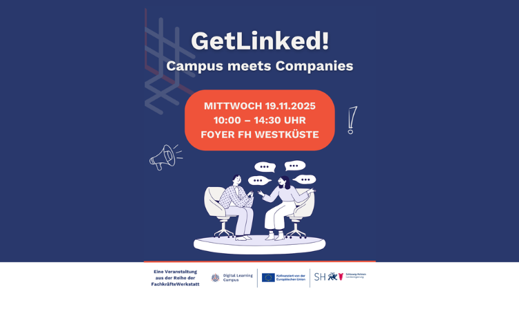 Du suchst nach dem perfekten Job, einem Platz für's Praxissemester, einem Praktikum oder einer praxisnahen Fragestellung für deine Abschlussarbeit? Dann komm' am Mittwoch, den 19.11.2025 von 10:00-14:30 Uhr an die FH Westküste zu GetLinked! – Campus meets Companies.