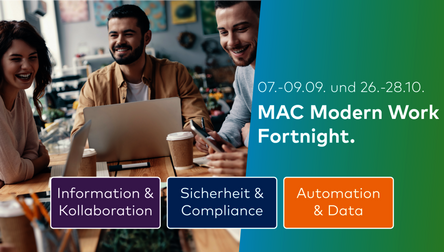 Werden Sie ein Modern Work Champion und sichern Sie sich die Plätze in den MAC Modern Work Fortnight Sessions im September (07.-09.09.) und Oktober (26.-28.10).