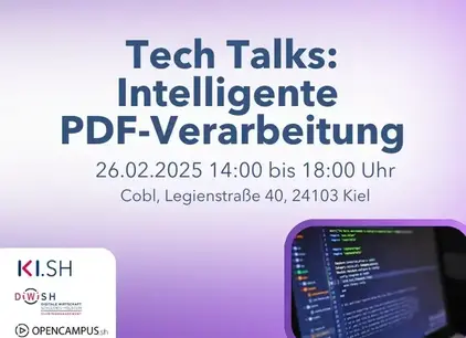 Die Tech Talks werden gemeinsam mit opencampus.sh und KI.SH veranstaltet und sind ein Angebot unserer Fachgruppe KI für das Netzwerk. Hierbei macht das Thema "Intelligente PDF-Verarbeitung" am 26. Februar von 14:00 bis 18:00 Uhr den Aufschlag.
