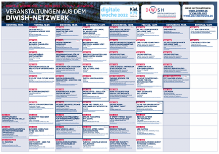 Am 11. September 2022 startet die #diwokiel bereits das sechste Mal! Mit einer Vielzahl von Veranstaltungen rund um digitale Themen schafft die Digitale Woche Kiel vom 11.-18.09.22 wieder den Rahmen für Wissensaustausch, Vernetzung und gemeinsames Lernen. Um bei der Vielzahl an Events den Überblick zu behalten gibt es natürlich auch dieses Jahr