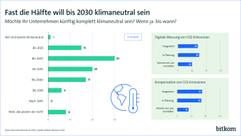 Die deutsche Wirtschaft setzt weiterhin stark auf den Klimaschutz und will zu großen Teilen die Ziele der Politik übertreffen. Fast die Hälfte der Unternehmen (45 Prozent) will bereits bis zum Jahr 2030 klimaneutral sein – weitere 37 Prozent bis 2040.
