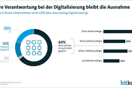 In vielen Unternehmen könnte es bald klarere Verantwortungen für die Digitalisierung geben. Zwar hatte Ende vergangenen Jahre nur jedes fünfte Unternehmen (20 Prozent) einen Chief Digital Officer (CDO) oder eine Leiterin bzw. einen Leiter Digitalisierung – und damit nur unwesentlich mehr als im Jahr zuvor (19 Prozent).