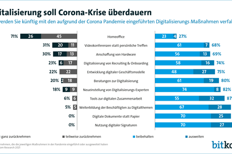 Der durch die Corona-Pandemie in der deutschen Wirtschaft ausgelöste Digitalisierungsschub ist von Dauer. Eingeleitete Maßnahmen wie Videokonferenzen oder Kollaborationstools, aber auch die Entwicklung neuer digitaler Geschäftsmodelle werden mehrheitlich beibehalten oder sogar noch ausgeweitet. Zugleich setzen sich die Unternehmen verstärkt mit der
