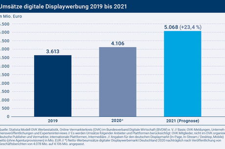 Der Online-Vermarkterkreis (OVK) im Bundesverband Digitale Wirtschaft (BVDW) e. V. hat neue Marktzahlen zur digitalen Werbewirtschaft veröffentlicht. Dabei hebt der OVK seine Prognose deutlich an: Der digitale Displaywerbemarkt wächst demnach 2021 in Deutschland um 23,4 Prozent. Damit überspringt der digitale Displaywerbemarkt mit 5,068 Milliarden