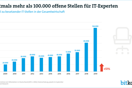 Die Zahl der offenen Stellen für IT-Fachkräfte erreicht eine neue Rekordmarke. In Deutschland gibt es aktuell 124.000 offene Stellen für IT-Spezialisten. Das entspricht einem Anstieg um 51 Prozent verglichen mit dem Vorjahr (82.000). Innerhalb von zwei Jahren hat sich damit die Zahl der unbesetzten IT-Stellen mehr als verdoppelt (2017: 55.000). Das