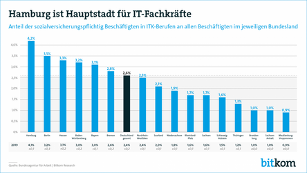 Hamburg ist das Bundesland mit der größten Dichte an IT-Spezialisten. Im hanseatischen Stadtstaat arbeiten 4,2 Prozent aller sozialversicherungspflichtig Beschäftigten als Informatiker oder in anderen ITK-Berufen, das sind 0,1 Prozentpunkte mehr als im Vorjahr und entspricht 4.200 IT-Jobs pro 100.000 Beschäftigte. Dahinter liegen Berlin (3,5 Prozent, +0,3 Punkte) und Hessen (3,3 Prozent, +0,2 Punkte). Es folgen Baden-Württemberg (3,2 Prozent, +0,2 Punkte) und Bayern (3,1 Prozent, +0,1 Punkte). Auch Bremen (2,8 Prozent, +0,2 Punkte) übertrifft den Bundesdurchschnitt von 2,6 Prozent (+0,2 Punkte). Knapp unter dem Schnitt liegt dagegen Nordrhein-Westfalen (2,4 Prozent, +0,1 Punkte). Auf den drei letzten Plätzen herrscht Stagnation: In Brandenburg (14., 1,0 Prozent), Sachsen-Anhalt (15., 1,0 Prozent) und Mecklenburg-Vorpommern (16., 0,9 Prozent) blieb die Informatiker-Quote unverändert niedrig. Sachsen-Anhalt rutschte dennoch einen Platz nach hinten, weil Brandenburg geringfügig mehr IT-Jobs schaffte.
