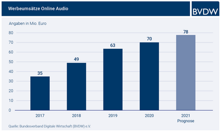 Die Werbeumsätze im Bereich Online Audio sind 2020 wie vom Bundesverband Digitale Wirtschaft (BVDW) e. V. prognostiziert auf rund 70 Millionen Euro angestiegen. Im Jahr 2019 lag der Umsatz noch bei 63 Millionen Euro. Im Bereich Podcast fielen die Werbeumsätze noch größer als vermutet aus: Statt der prognostizierten 14 Millionen Euro lag der Umsatz im Bereich Podcast bei rund 16 Millionen Euro.