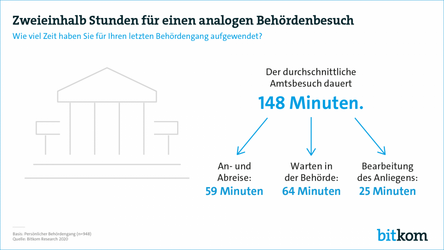 Wie groß der Handlungsbedarf weiterhin ist, zeigt ein Blick auf die Abläufe in den Ämtern und Behörden. Der Gang zum Amt kostet die Menschen in Deutschland durchschnittlich 148 Minuten. Davon entfallen 59 Minuten auf die An- und Abreise, 64 Minuten auf das Warten in der Behörde und 25 Minuten auf den eigentlichen Zweck des Besuchs: die Bearbeitung des jeweiligen Anliegens. Insgesamt sind acht von zehn Bürgern (83 Prozent) der Meinung, Ämter brauchen prinzipiell zu lange, um ihre Vorgänge zu bearbeiten. Und so verwundert nicht, dass 76 Prozent der Ansicht sind, mit digitalen Behördengängen könne Zeit gespart werden. Und für jeden Zweiten (52 Prozent) ist klar: Die meisten Verwaltungsangelegenheiten könnte man problemlos online erledigen. „Es kann nicht sein, dass Menschen Urlaub nehmen müssen, nur um einen schlichten Verwaltungsvorgang anzustoßen. Nicht nur während der Corona-Krise sind solche Verpflichtungen völlig anachronistisch. Ziel muss sein, ohne Ausnahme alle Verwaltungsleistungen in Bund, Ländern, Gemeinden und nachgeordneten Behörden digital anzubieten“, so Rohleder.