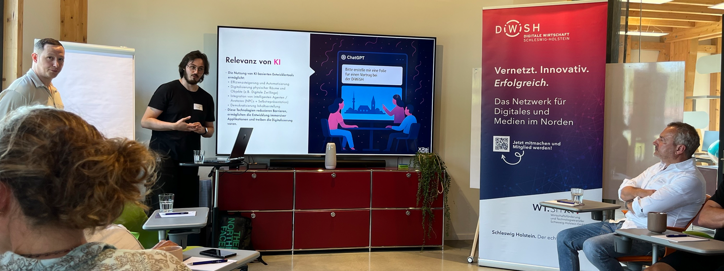 Ein inhaltliches Highlight war die Präsentation von Erik Stölting und Phillip Schwarz vom Forschungs- und Entwicklungszentrum der FH Kiel. Sie zeigten eindrucksvoll, wie KI-gestützte Tools und Extended-Reality-Anwendungen bereits heute kreative Prozesse unterstützen – und warum Technologien wie XR eine sinnvolle Erweiterung, nicht aber einen Ersatz bestehender Medien darstellen. Zudem stellten sie das Projekt XRai Vision vor, das kleinen und mittleren Unternehmen den Einstieg in Extended Reality erleichtert – inklusive kostenfreiem XR-Readiness-Assessment und Workshopangebot.
