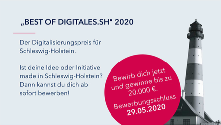 Es gibt zahlreiche tolle Entwicklungen und Ideen made in Schleswig-Holstein. Sie alle können Aufmerksamkeit sehr gut gebrauchen – und sie haben sie verdient. Deshalb hat die Landesregierung den Wettbewerb „Best of Digitales.SH“ ins Leben gerufen. Mit ihm sollen kreative Tüftlerinnen und Tüftler im Land unterstützt und bekannter gemacht werden. Der Preis richtet sich in diesem Jahr an Projekte aus dem Bildungs- und sozialen Bereich. Der Preis ist mit Preisgeldern in Höhe von 75.000 € verbunden.