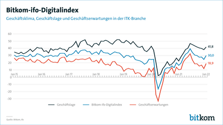 Hinweis zur Methodik: Der Digitalindex basiert auf der monatlichen ifo Konjunkturumfrage und bildet sich aus dem geometrischen Mittel des Index der Geschäftslage und des Index der Geschäftserwartungen. Berücksichtigt werden Daten der Digitalbranche, die sich aus Unternehmen der Sektoren Verarbeitendes Gewerbe, Handel und Dienstleistungssektor zusammensetzt. Dazu zählen Hersteller von IT und Kommunikationstechnik, Unterhaltungselektronik, Anbieter von Software und IT-Dienstleistungen, Telekommunikationsdiensten sowie der Groß- und Einzelhandel mit ITK. Der Index wird als Saldo (saisonbereinigt) dargestellt. Gewichtet wird nach Anzahl der Beschäftigten. Befragungszeitraum war vom 5. bis 24. Januar 2022.