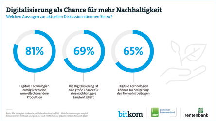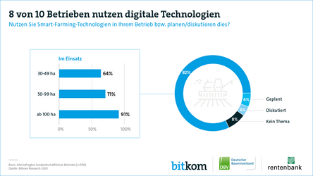 Hinweis zur Methodik: Grundlage der Angaben ist eine Umfrage, die Bitkom Research im Auftrag des Digitalverbands Bitkom, des Deutschen Bauernverbandes und der Landwirtschaftlichen Rentenbank durchgeführt hat. Dabei wurden im Februar und März 2020 500 Landwirte mit Betrieben ab 30 ha im Westen und 100 ha im Osten befragt. Die Umfrage ist repräsentativ.