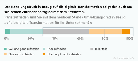 »Die Unternehmen, die bisher in Sachen Digitalisierung nichts gemacht haben, betreiben jetzt operatives Krisenmanagement. Zwar sind technisch einige Dinge in Bewegung geraten – natürlich auch zwangsläufig –, aber der echte Veränderungswille fehlt. Das merkt man vor allem daran, dass Unternehmen zwar nach außen einen modernen Anstrich zeigen, aber kreative Köpfe nicht lange bei sich halten können«, so Dr. Josephine Hofmann, Mitverfasserin der Studie und Leiterin des Bereichs Zusammenarbeit & Führung am Fraunhofer IAO. Das belegen auch die Ergebnisse der Studie. So hat ein Großteil der Befragten die Fähigkeit, Bedrohungen und Chancen für das bestehende Geschäftsmodell frühzeitig zu erkennen, positiv eingeschätzt. Doch bei der Einschätzung, daraufhin zügig zukunftsorientierte Handlungsmaßnahmen zu entwickeln und umzusetzen, fallen die Ergebnisse schlechter aus. Den Fragen in Bezug auf eine innovationsorientierte Unternehmenskultur sind zwar gute Werte für eine gelebte Vertrauenskultur und authentisches Führungsverhalten zu entnehmen. Doch 48 Prozent der Befragten nahmen bei der Aussage, dass kreative Mitarbeitende angezogen und im Unternehmen bleiben, eine »teils / teils«-Haltung ein. Dieses gemischte Bild zeigt sich auch in der Unzufriedenheit der Befragten mit dem Stand der digitalen Transformation. 30 Prozent sind voll und ganz zufrieden bzw. eher zufrieden – 70 Prozent sind es jedoch nicht.