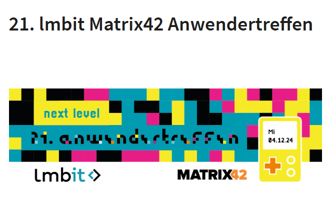 Wir laden Sie herzlich am Mittwoch, den 04.12.2024 von 9.00 bis 16.00 Uhr zu unserem 21. lmbit Matrix42 Anwendertreffen ein.