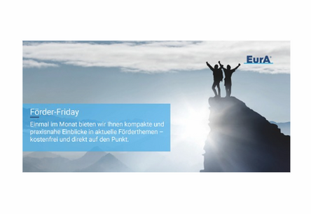 Mit dem EurA Förder-Friday lädt Sie die EurA AG einmal im Monat freitags zu einem kompakten, kostenfreien Austausch rund um aktuelle Förderthemen ein. In nur einer Stunde erhalten Sie fundierte Einblicke, praxisnahe Einschätzungen und Antworten auf Ihre individuellen Fragen.