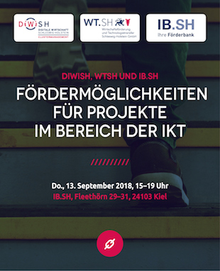 In Kooperation mit der Nationalen Kontaktstelle (NKS) für europäische Forschungsförderung zu den Informations- und Kommunikationstechnologien (IKT), der Investitionsbank SH (IB.SH), dem Clustermanagement Digitale Wirtschaft Schleswig-Holstein (DiWiSH) und der Wirtschaftsförderung und Technologietransfer Schleswig-Holstein GmbH (WT.SH) laden wir Sie herzlich ein zur Informationsveranstaltung.