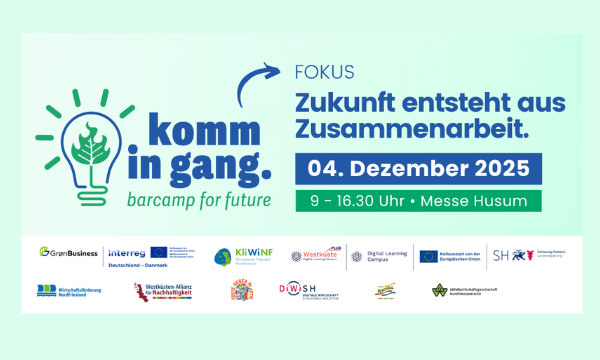 Mit dem Digital Learning Campus Westküste PLUS, der Westküsten-Allianz für Nachhaltigkeit und dem Projekt Klimaneutrale Wirtschaft NF haben wir starke Partner an unserer Seite – für eine Veranstaltung, die echte Verbindungen schafft: zwischen Menschen, Branchen und Regionen.