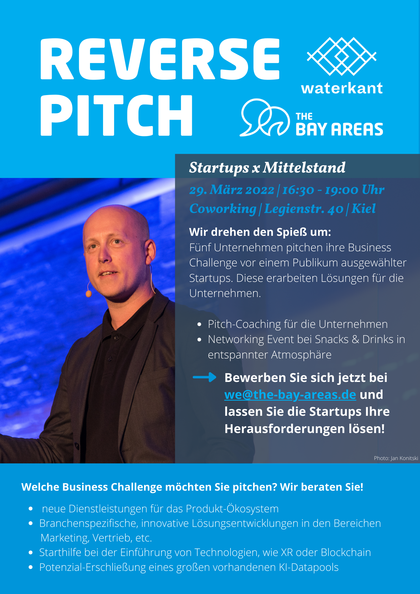 The Bay Areas geht ein komplett neues Projekt an: „Reverse Pitch“, ein neues Eventformat in der Startup-Szene, das gemeinsam mit dem Waterkant Festival am 29. März 2022 veranstaltet wird.