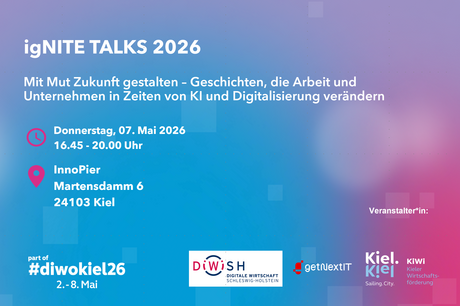 Im Rahmen der Digitalen Woche Kiel 2026 starten wir die nächste IgNITE – diesmal unter dem Leitmotiv: Mit Mut Zukunft gestalten – Geschichten, die Arbeit und Unternehmen in Zeiten von KI und Digitalisierung verändern